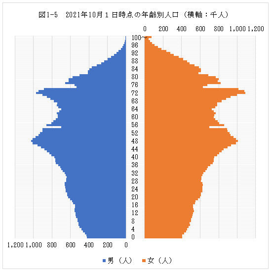 合計特殊出生率が低下した結果、日本の人口ピラミッドは図1—5のように不安定な形になっています。底辺の広い本来の安定したピラミッド型ではなく、底辺の狭い異常な年齢別人口構成であることを示しています。