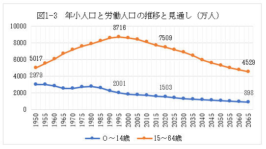 図1—3は年少人口(0~14歳)と労働人口(15~64歳)の推移を示しました。図1—3は2020年までは実績値でそれ以降は推計値です。出生数の低下は年少人口の減少となり、年少人口の減少は数年後には労働人口の減少となって日本の国力を弱めます。この様子が図1—3から見て取れます。この図1—3では、15~64歳までの人を、日本や国際的な慣例に従って労働人口としました。
