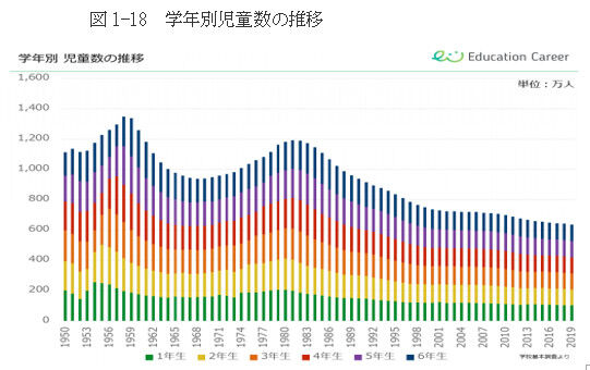 少子化は必然的に小学生の児童数の減少となります。Education Careerによる「【2020年版】小学校の児童数の推移に関する統計まとめ」によれば、図1—18のようになっており、次の記述があります。