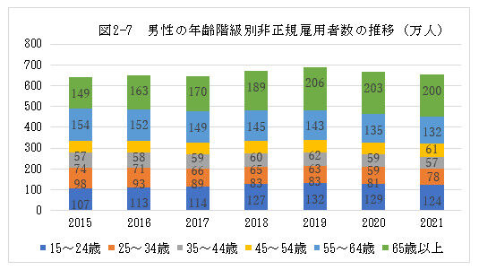 非正規雇用労働者数の年齢階級別の推移を図2—7、図2—8に示します。