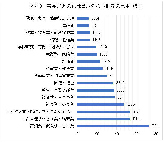 業界ごとの非正規雇用労働者が働いている人数の比率を図2—9に示します。非正規雇用労働者はサービス業関連と小売業など、飲食・宿泊・娯楽・生活関連サービス・卸売り・小売りなどの生活に密着した業界で特に多いようです。