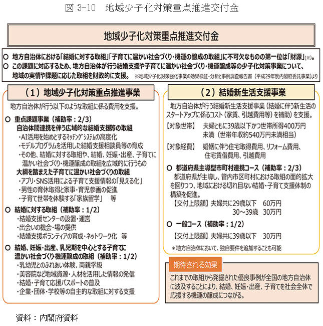 内閣府は、「地域少子化対策重点推進交付金」 により、地方公共団体が行う総合的な結婚支援の取組を支援しており、特に2021年度においては、AIを始めとするマッチングシステムの高度化等を新たな重点課題として支援(補助率を2分の1から3分の2にかさ上げ)した。また、一定の所得以下の新婚世帯に対し、結婚に伴う新生活のスタートアップに係るコスト(新居の家賃、引越費用等)を支援する「結婚新生活支援事業」について、2021年度から年齢要件を34歳以下から39歳以下に、世帯年収要件を約480万円未満相当から約540万円未満相当にそれぞれ緩和するとともに、都道府県が主導して管内市町村における本事業の面的拡大を図る優れた取組については、補助上限額の引き上げと補助率のかさ上げを行った。その結果、2021年度の実施自治体数は538団体となり、2020年度の291団体を大きく上回った。