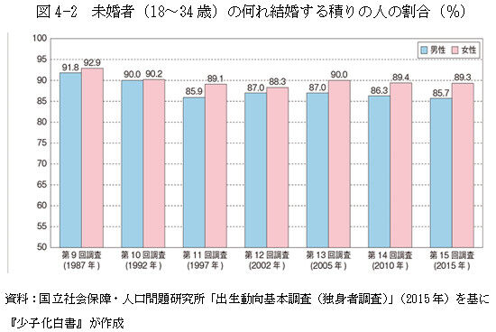 『少子化白書』の未婚者(18~34歳)のうち「いずれ結婚するつもり」と答えた者の割合を図4—2として転載します。