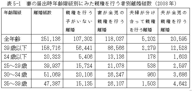図5—5を見ると、39歳以下の出産適齢層が全離婚組数の63.2%を占めており、この人たちの離婚により多くの出産のチャンスが失われていたのです。「統計表」の第12—1表により、妻の離婚時の年齢を基準とした親権を行う者別離婚件数(平成20)の関連部分を表5—1として作成しました。