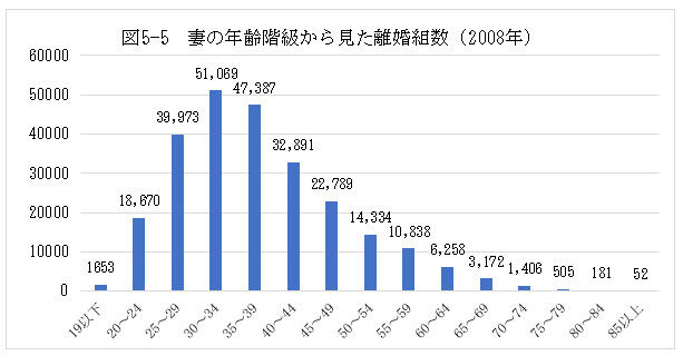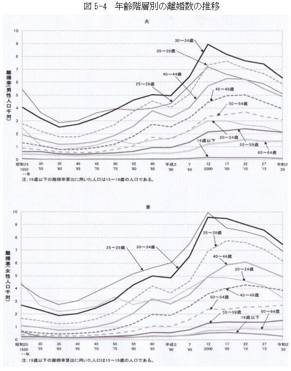 図5—4 年齢階層別の離婚数の推移を見ると、男女共に出産可能年齢である25~39歳までの年齢層の人たちの離婚率が高く、出生数の減少にこの層の人たちの離婚が拍車をかけていると思われます。