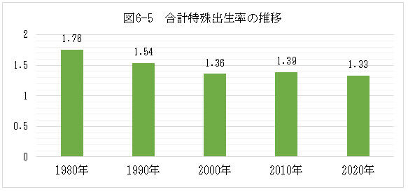 合計特殊出生率は一人の女性が一生の間に平均して生む子供の数です。最近40年間の10年ごとの推移を図6—5にしました。