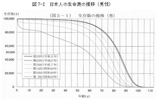 図7—2と図7—3は、生まれた10万人のその後の生存数の推移を年齢の経過と共に示してあり、年齢が高くなるにしたがって男性では75歳ごろから、女性では83歳前後から急激に生存者の数が減少し、男性では105歳で生存者はほぼゼロになり、女性では110歳でほぼゼロになっています。
